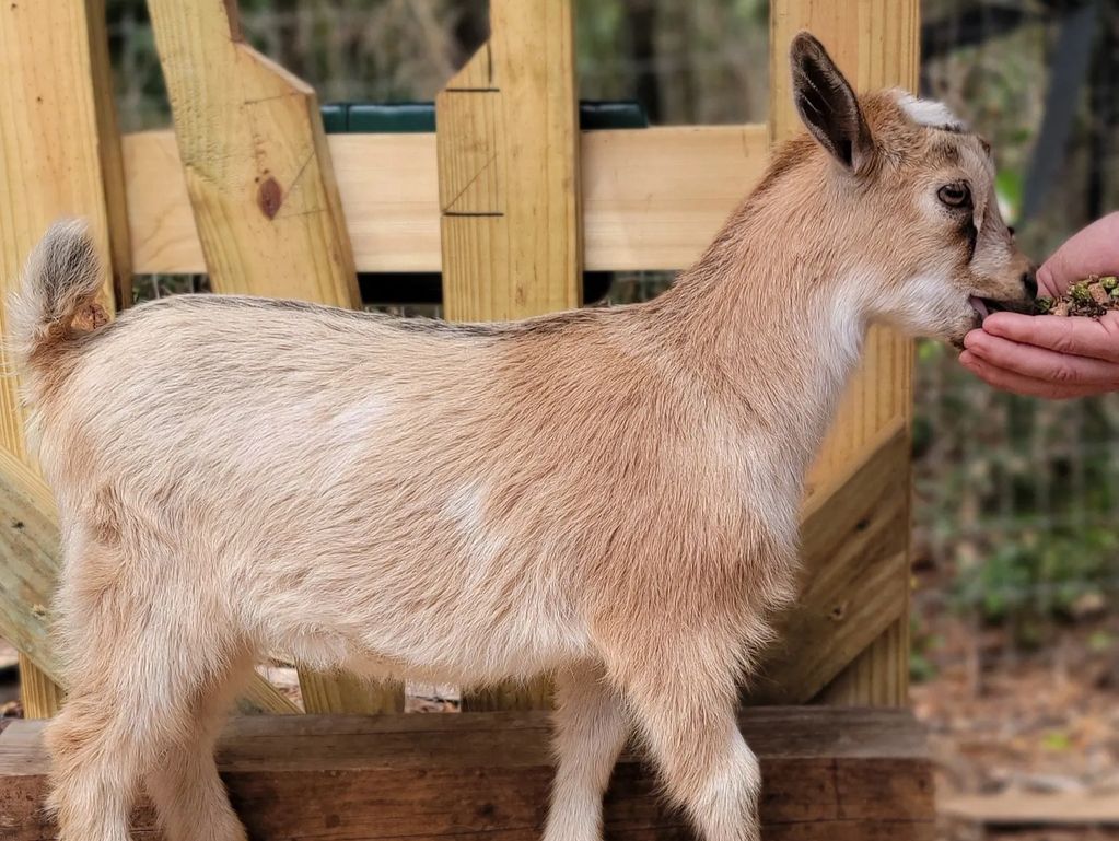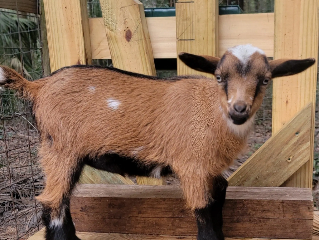 Anna is a purebred Nigerian Dwarf doeling. She was born 1/31/2026, has brown eyes, and is naturally polled.